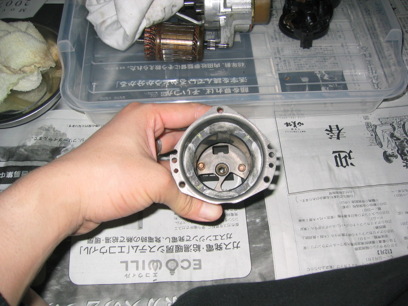 まずはセルモーター内を清掃します。濡れぞうきんを堅く絞って拭きます。特に奥の方はブラシが削れた粉と思われる物が大量に付着していますので、奥までしっかり拭いて下さい。