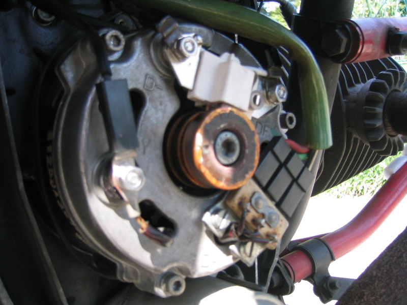 最後に発電機を車体に戻します。ブラシを指で押し戻しながらはめ込みます。はめ込んだら三本のボルトで固定します。その後、各ケーブルを接続します。接続はデジカメで撮ってあった写真を参考に元に戻します。このとき各端子が錆びていれば、紙やすりや真鍮ブラシで磨いてさびを落とし、薄くグリスを塗っておきます。また平型端子が緩んでいるときは、メス方をラジオペンチなどで軽く潰してかしめると良いでしょう。